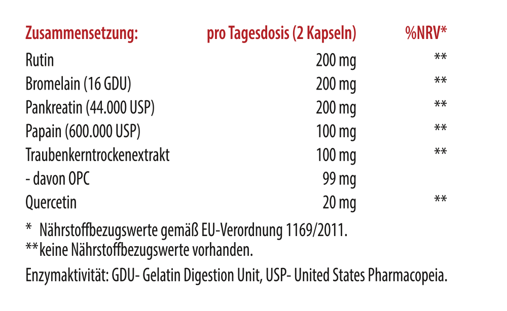 Rutinreicher Sophora japonica Blütenextrakt, Bromelain, Pankreatin, Überzugsmittel: Hydroxypropylmethylcellulose (magensaftresitente Kapselhülle), Pektin, Papain (Enthält Sulfite), Traubenkerntrockenextrakt (mit oligomeren Proanthocyanidinen), Trennmittel: L-Leucin, quercetinreicher Sophora japonica Blütenextrakt.