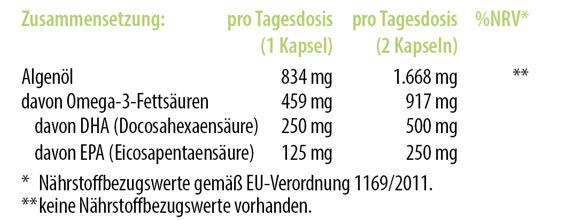 - Rein pflanzliche Kombination mit hochwertigen Omega-3-Fettsäuren (DHA, EPA).