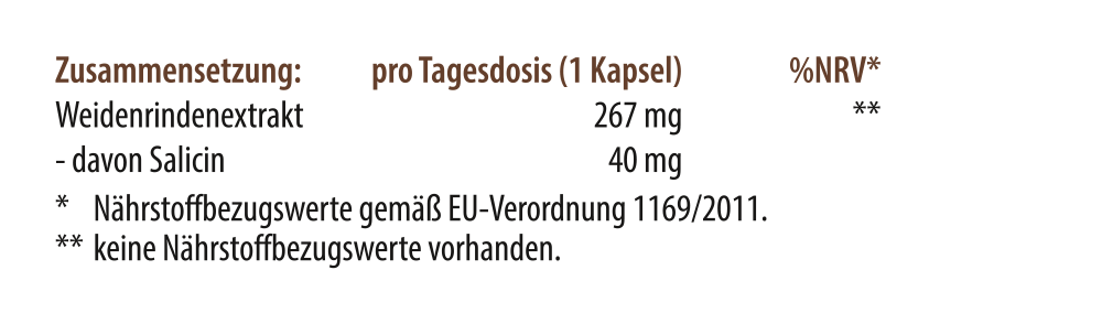 - Natürliches Salicin aus Weidenrindenextrakt und besteht aus 40 mg Salicin pro Kapsel