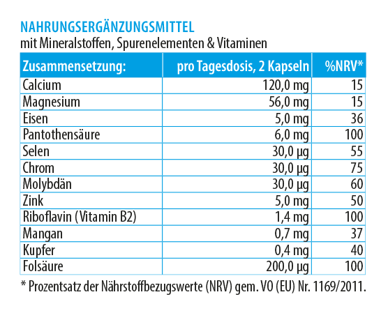 Calciumcitrat, Säureregulator Kaliumcitrat, Magnesiumcitrat, Magnesiumoxid, Füllstoff Cellulose-Pulver, Reisstärke, Eisencitrat, Zinkcitrat, Trennmittel Calciumsalze der Speisefettsäuren, Calcium-D-pantothenat, Mangancitrat, Kartoffelstärke, Riboflavin, Kupfersulfat, Calcium-L-Methylfolat, Chrom(III)chlorid, Natriumselenat, Natriummolybdat.