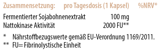 - Jede RepaVital Nattokinase-Kapsel enthält 100 mg fermentierten Sojabohnenextrakt mit 2.000 fibrinolytischen Einheiten (FU)
