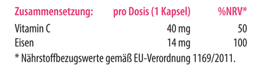 Hinweise:"Die angegebene, empfohlene Verzehrsmenge darf nicht überschritten werden". Nahrungsergänzungsmittel dienen nicht als Ersatz für eine ausgewogene und abwechslungsreiche Ernährung und gesunde Lebensweise. Außerhalb der Reichweite von kleinen Kindern aufbewahren. Männer, postmenopausale Frauen und Schwangere sollten Eisen nur nach Rücksprache mit ihrem Arzt einnehmen. Auf den Verzehr weiterer Nahrungsergänzungsmittel mit Eisen ist zu verzichten.