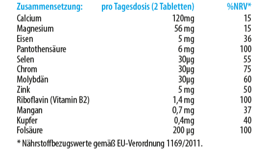 Calciumcitrat, Säureregulator Kaliumcitrat, Magnesiumcitrat, Magnesiumoxid, Füllstoff Cellulose-Pulver, Reisstärke, Eisencitrat, Zinkcitrat, Trennmittel Calciumsalze der Speisefettsäuren, Calcium-D-pantothenat, Mangancitrat, Kartoffelstärke, Riboflavin, Kupfersulfat, Calcium-L-Methylfolat, Chrom(III)chlorid, Natriumselenat, Natriummolybdat.