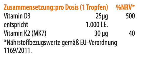 MCT-Mittelkettige Triglyceride aus Kokosöl, Vitamin D3 (Cholecalciferol aus Schafswolle gewonnen), Vitamin K2 (Menachinon MK-7).