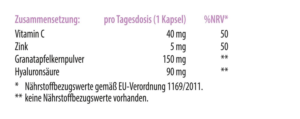 Pomegranate seed powder (Punica granatum), Sodium hyaluronate, Coating agent: Hydroxypropyl methylcellulose (plant based capsule shell), L-ascorbic acid, Zinc gluconate.